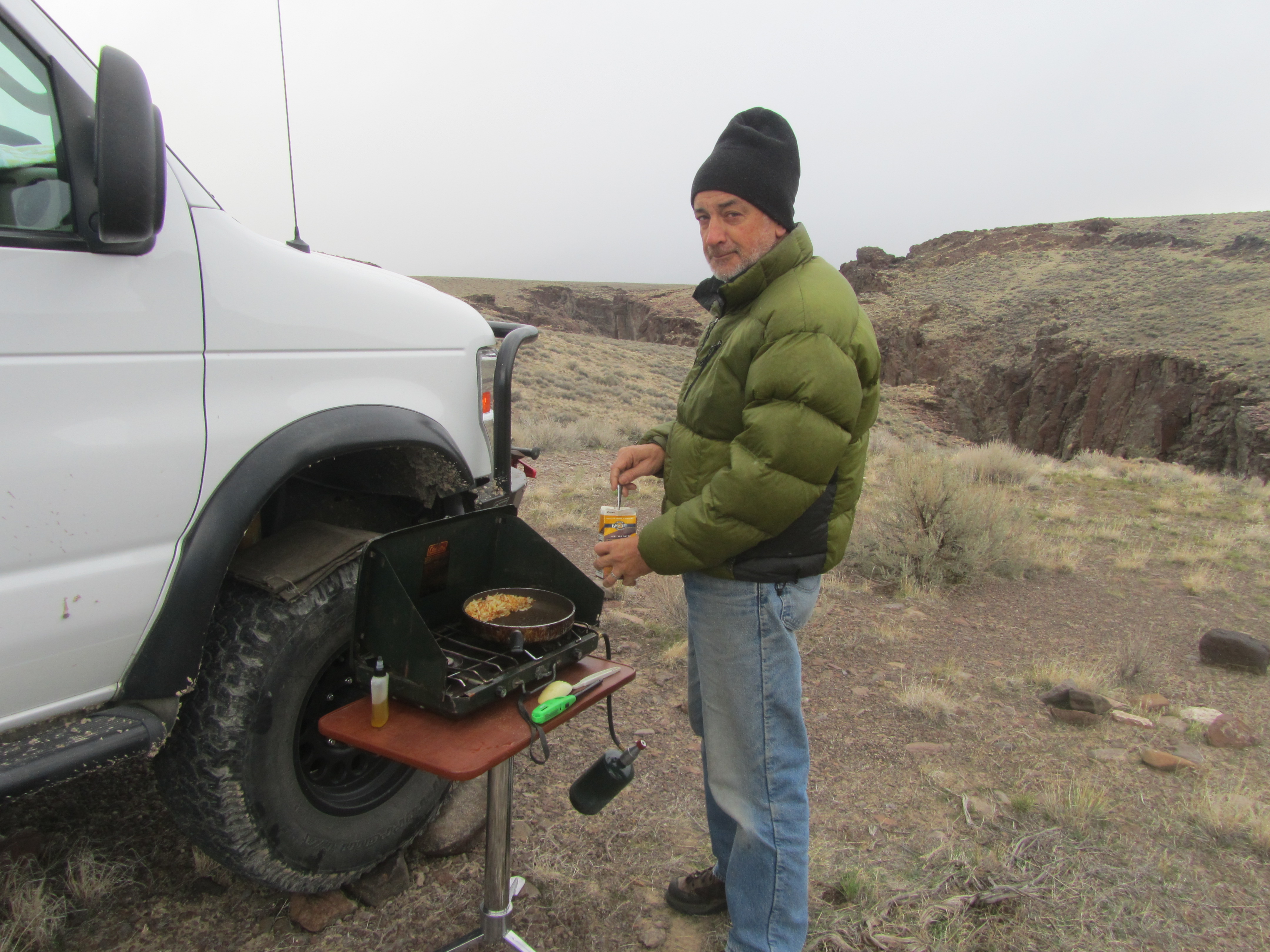 Larry fries up some potatoes and eggs for breakfast while I stay inside Moby and enjoy the propane heater. Maybe that’s why he looks annoyed . . . ?