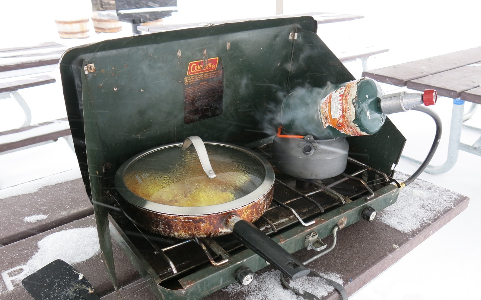 It was so cold that the propane valve kept freezing, so Larry found a solution.