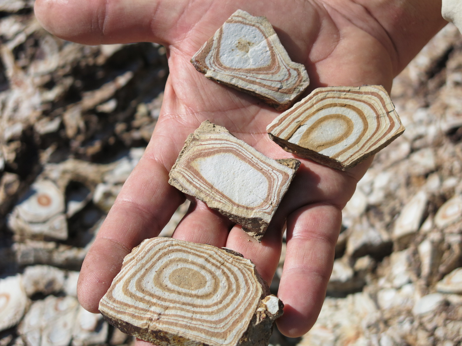 Once in Death Valley, we head for the canyons on the east side of the Panamint Mountains above Badwater Basin. Our ongoing quest: finding enough drinkable springs to make a backpack trip of it someday. Our first day out (looking for water) turns up these weird rocks. They pave the bottom of a dry creek bed, most of them too big and too thick to budge. We don’t know what kind of rock this is, so we dub them Cinnamon Roll Rocks. Geologist pals out there–any ideas on how these are formed?