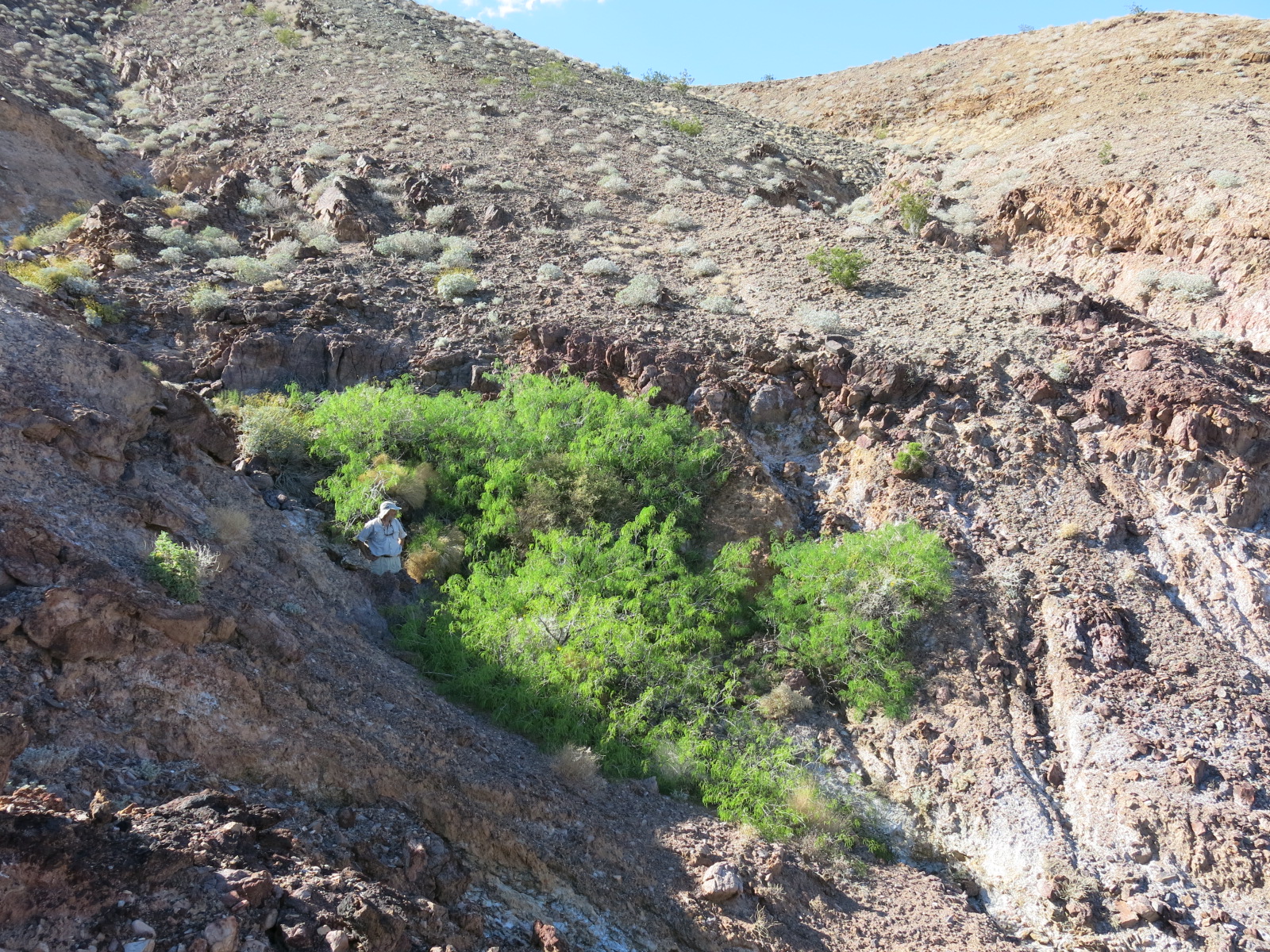 We make our way down to the trees, and Larry finds a pool of standing water. Closer inspection reveals that, in addition to water, the pool holds scores of insect larva, one bloated caterpillar body, and one decaying chuckwalla tail. How can you tell if it’s good to drink? Larry thinks the best way is to give it a try. The result? Salty with bitter, non-sodium salts, says Larry.