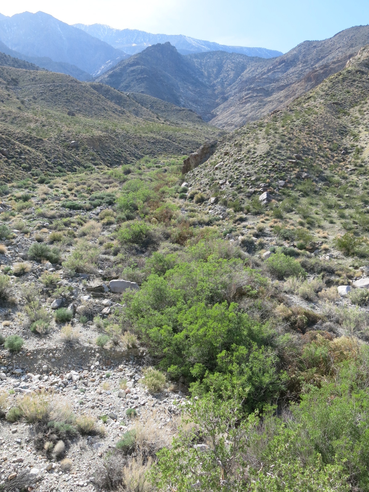 Shorty located his mining operation near a spring that feeds a small stream that runs down the canyon a short distance. Green shrubs line the creek.