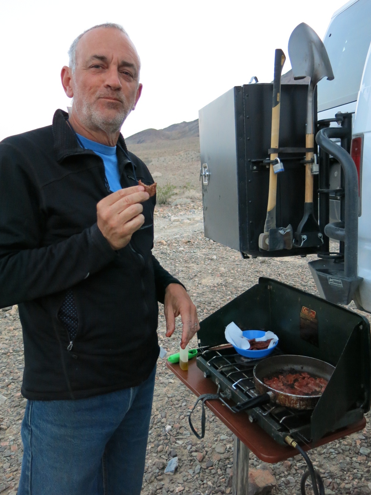 We return to Moby after dark and with sore feet. We found good water, and Larry marks it on his map for his someday backpack route. In the morning, we enjoy the sun and Moby’s luxury accommodations.