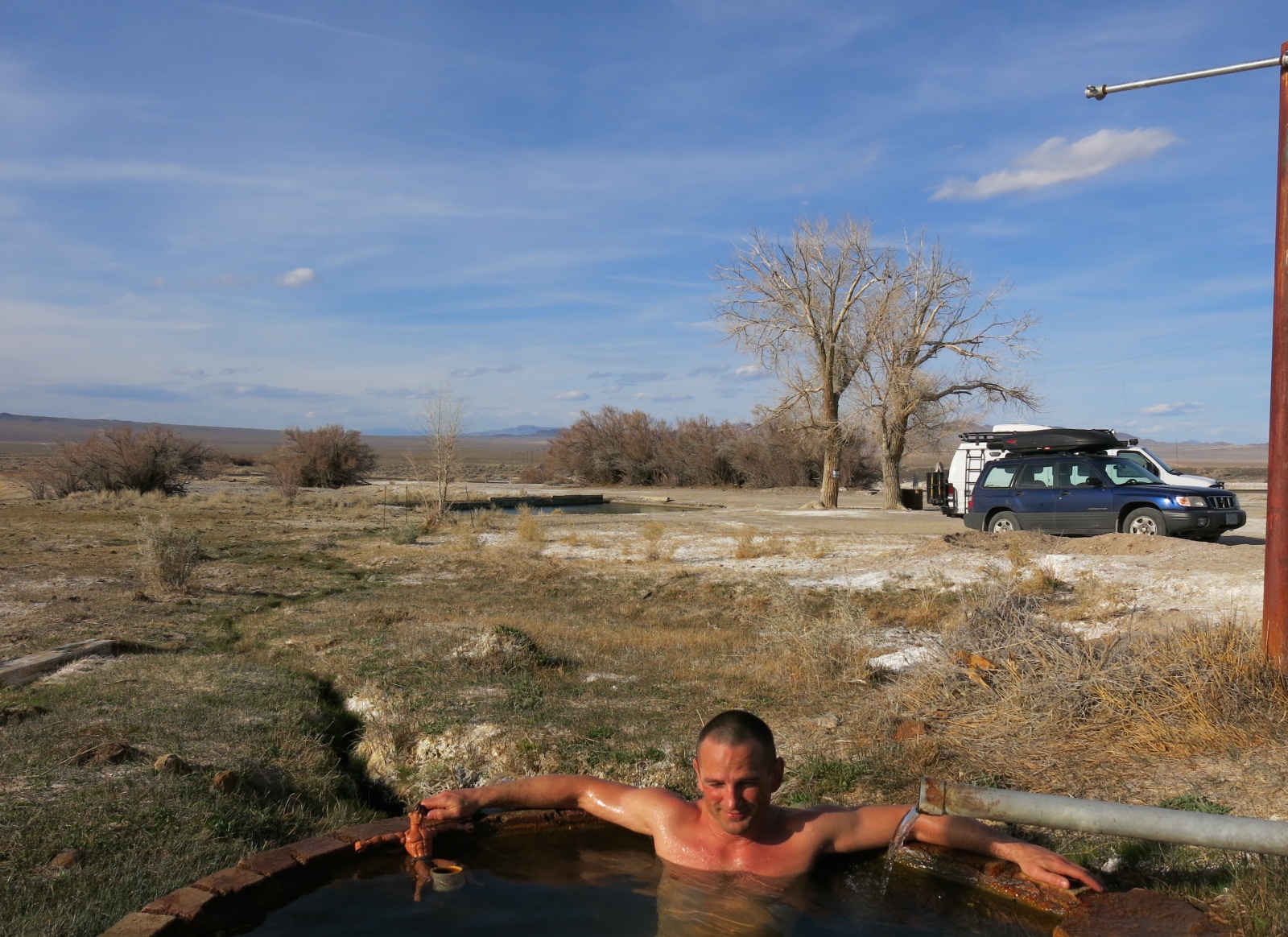 North of Death Valley, outside of Goldfield, NV, Doug and Mike share a soak before heading back to Portland.