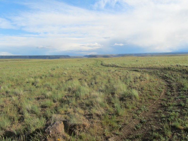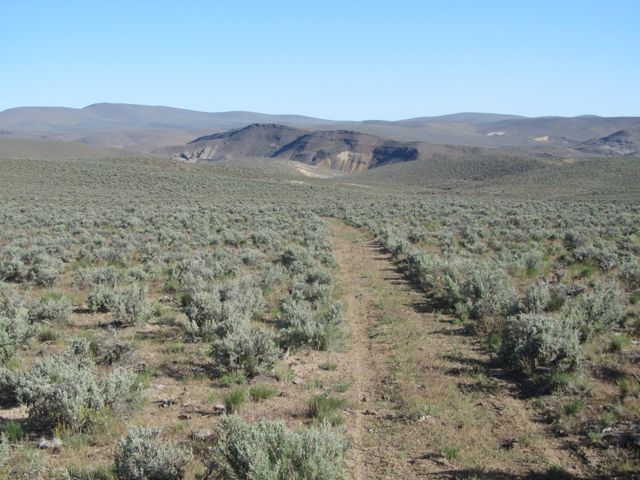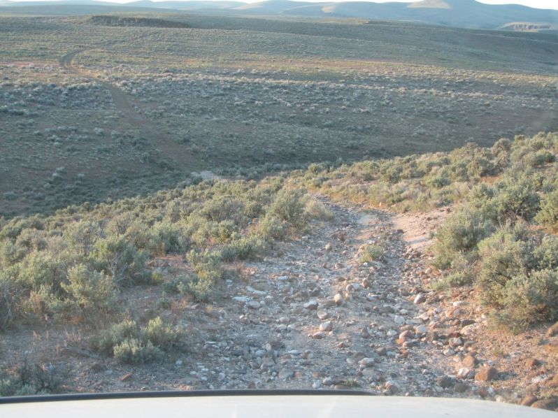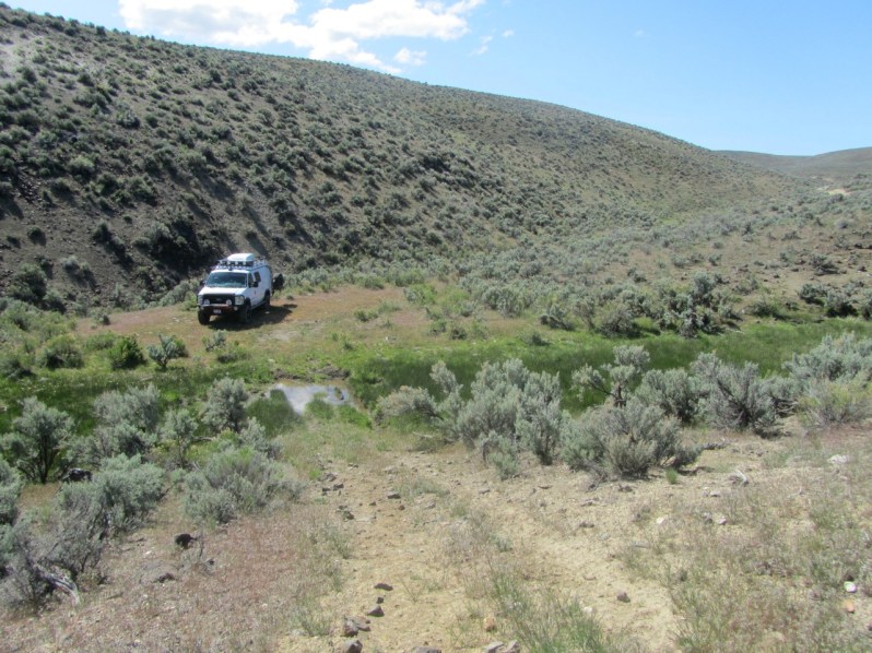 The hiking day done, most folks spent the night and headed back to civilization on Sunday. But I had a favorite  secret stream to return to, and trout to catch, so I headed north. This is the view back toward the Rinehart Ranch and the Owyhee canyon. Perhaps one or two rigs had driven this road all spring, but Moby’s were the only tracks in the dirt on this day.