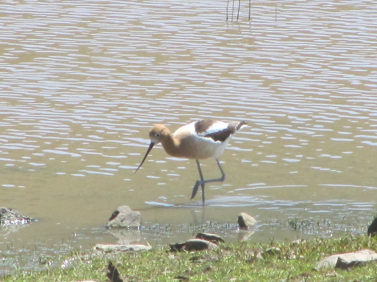 Desert cattle country is full of little check dams built by ranchers to catch a bit of snowmelt runoff or spring rains. They usually go dry before the end of summer. But in the spring these little reservoirs are a magnet for migrating birds like this American Avocet.