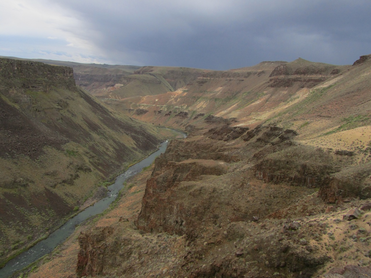 But ONDA is about more than using volunteer labor. Part of what they do is to help people experience the desert country, in hope that people will then be more likely to care for it and join the efforts to help protect it. So after working a good full day on Friday we were done with our good deed, which left Saturday for play. Some folks went of on a short hike with a naturalist, while the rest of us went on a longer hike down to the river. We followed the canyon rim as seen here for about 4 miles, then dropped down to the river just above where it goes out of sight here in this photo.