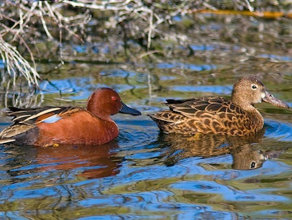 The Cinnamon Teal were spectacular, with the males sporting thier springtime-only trademark breeding colors. But they were too spooky to catch on camera, so I snagged this pair off the internet.