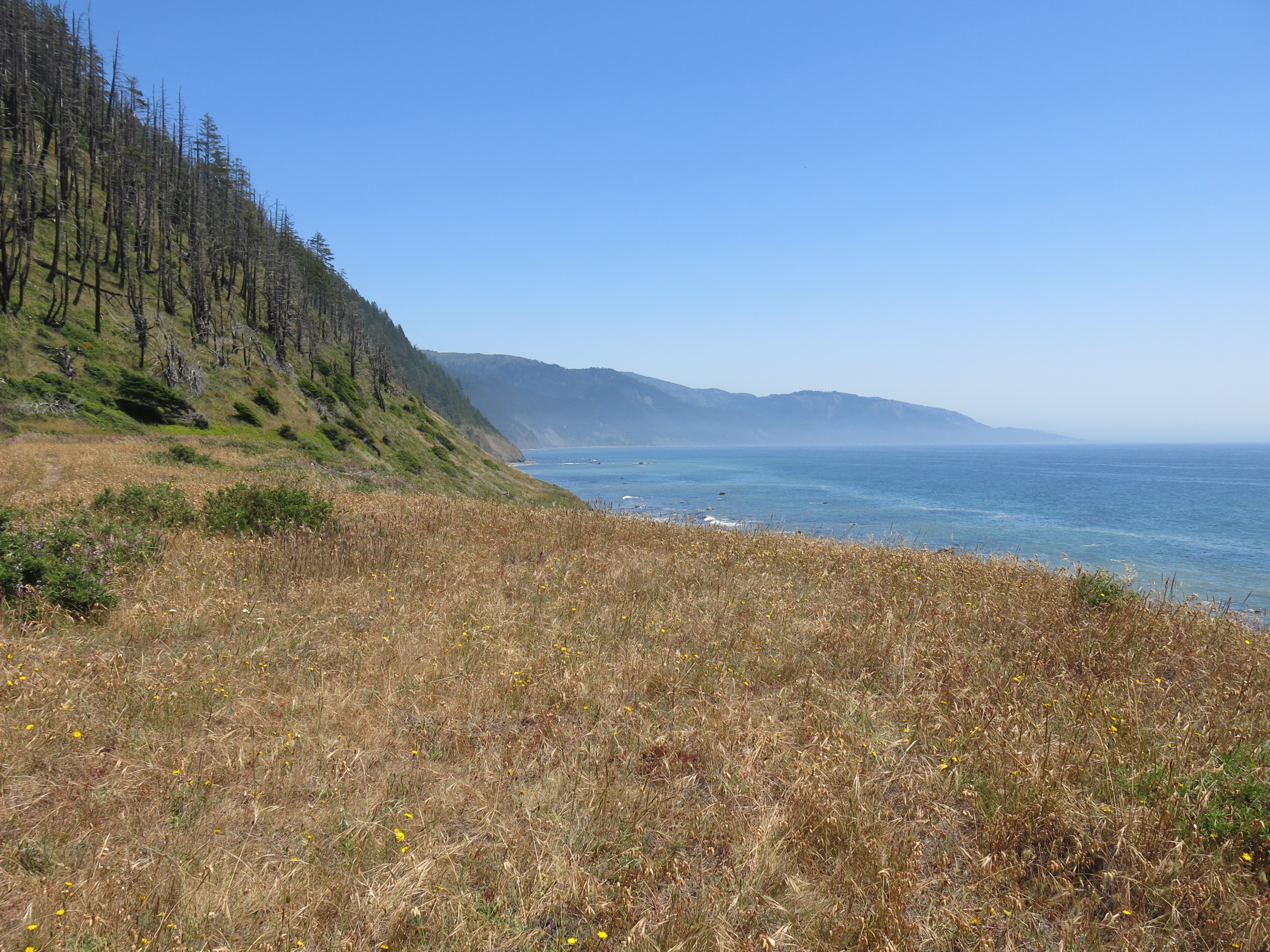 Although most of the hike was lush, there were many places where the grass was already dry in early June. These trees were killed in a recent forest fire.