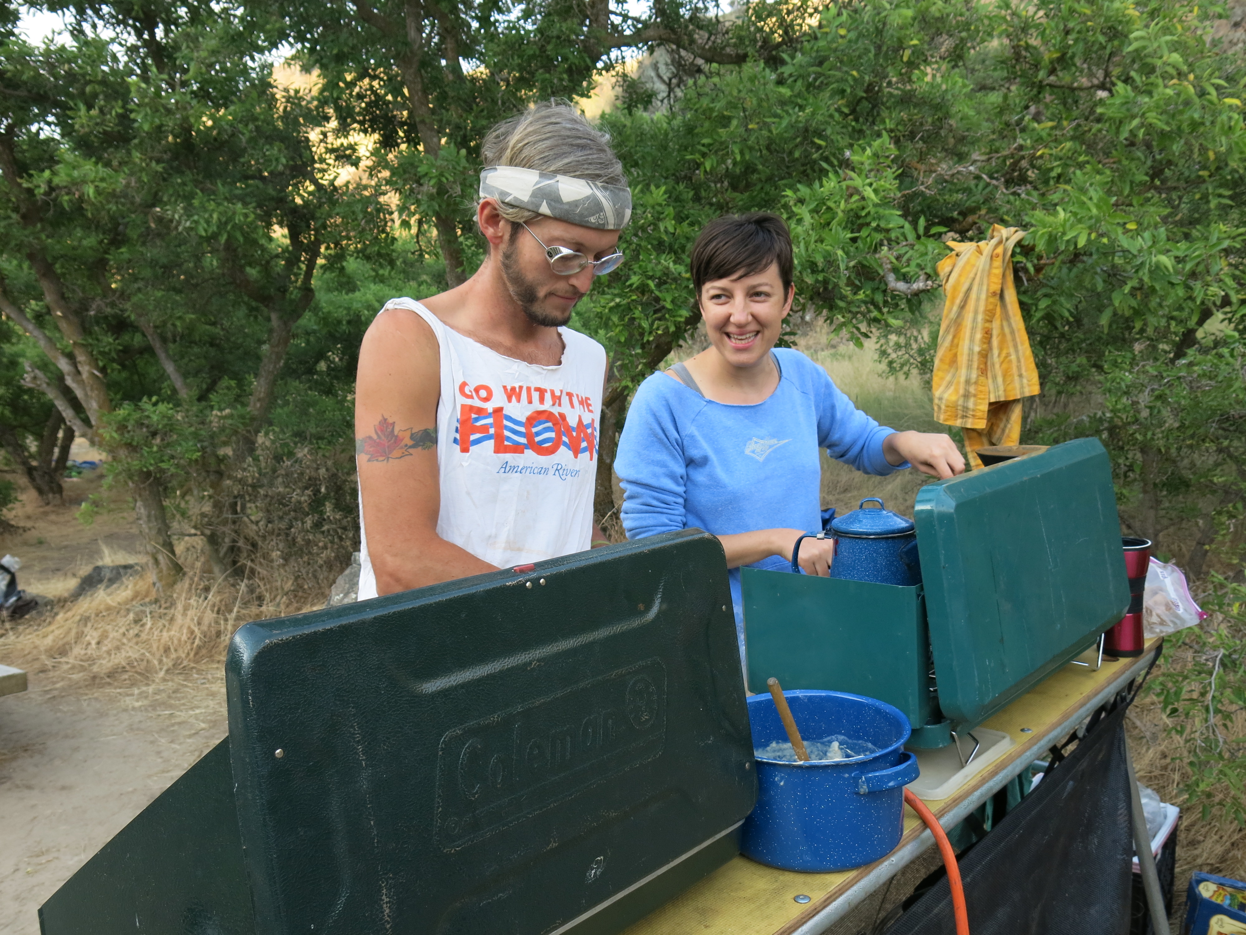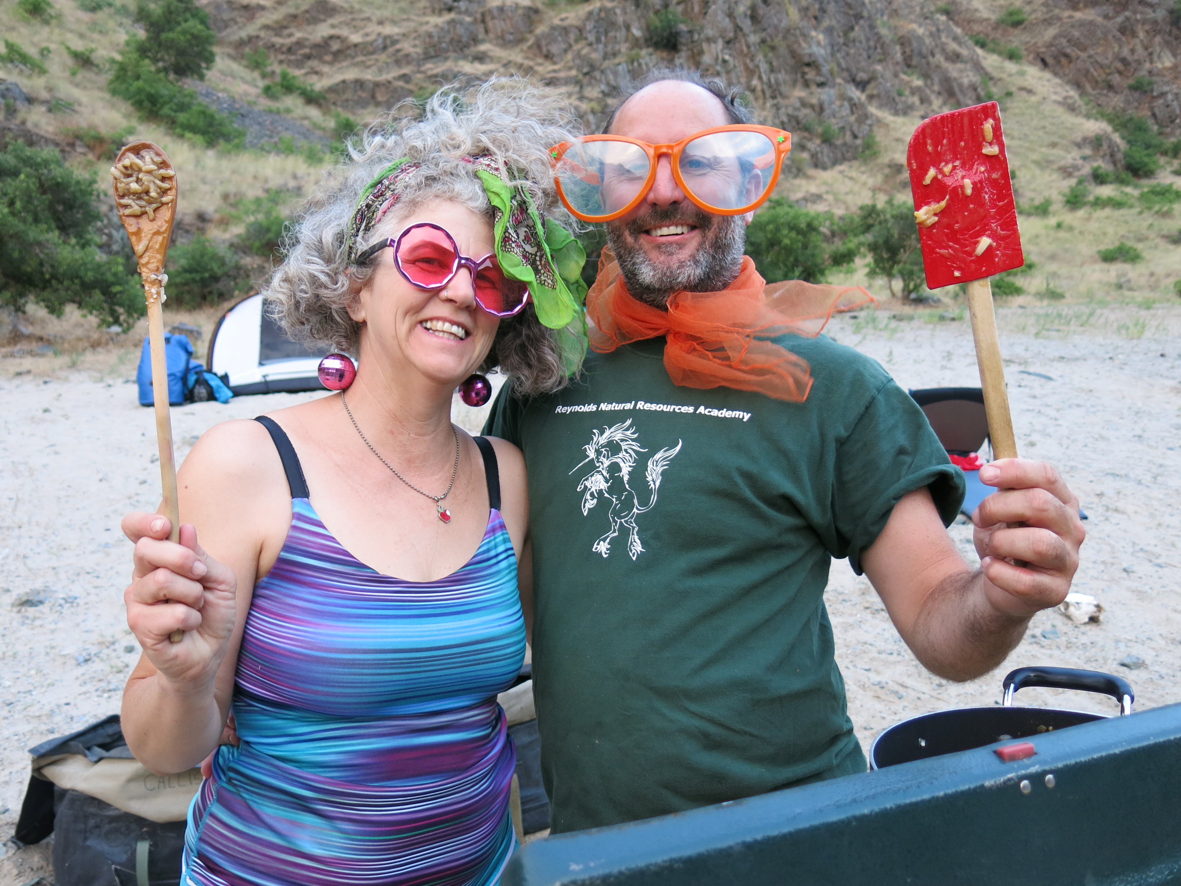Susie and Marty prepare their signature risotto.Ethan and Hannah whip up a feast for Thai night.Despite having rowed several thousand river miles, this is Keith’s first trip through Hells Canyon.Noelle and Lawrence serve up burgers and smiles.Marshall, Mike, and Larry dress for dinner.Dolly and Doug round out the crew.