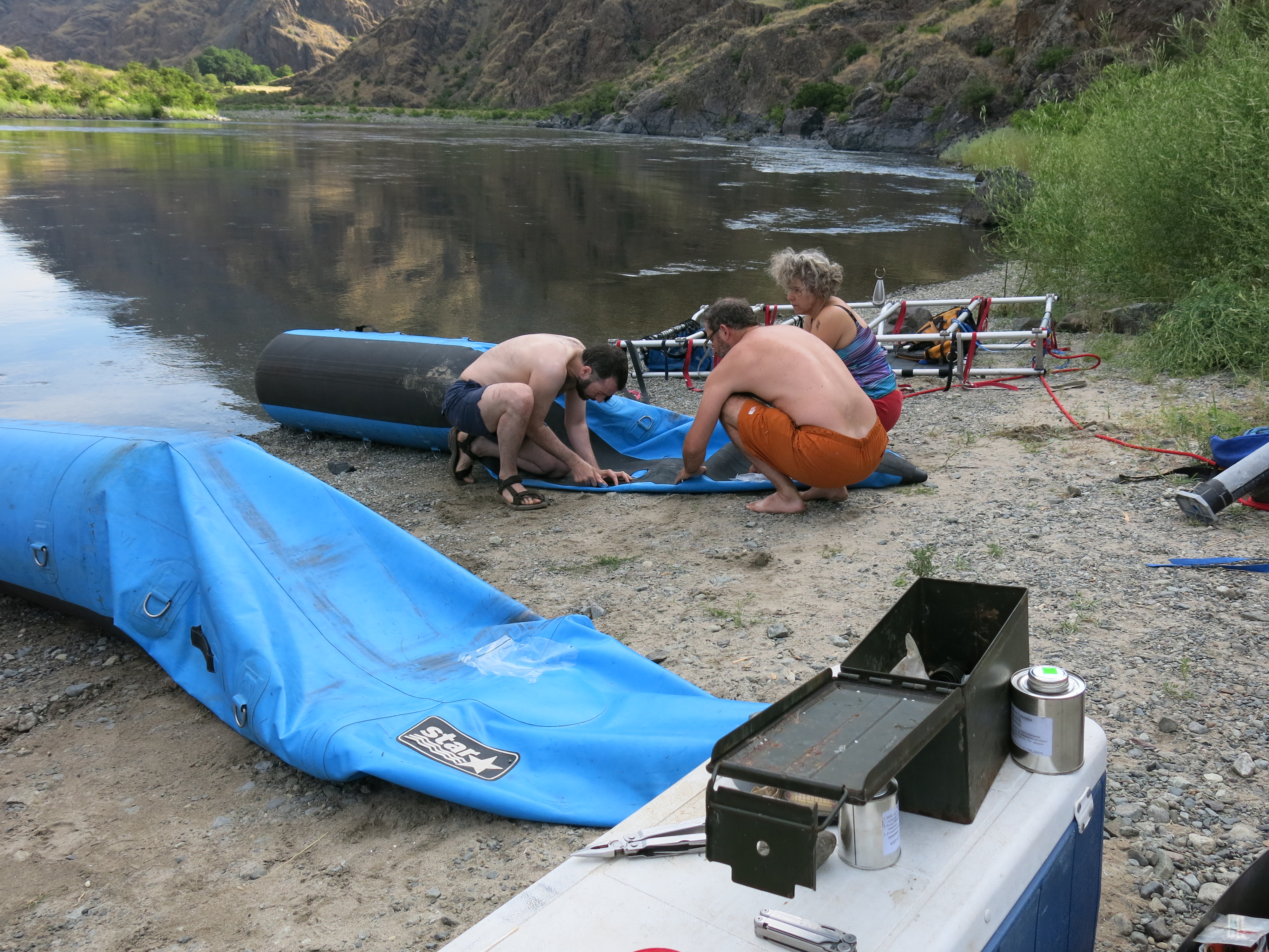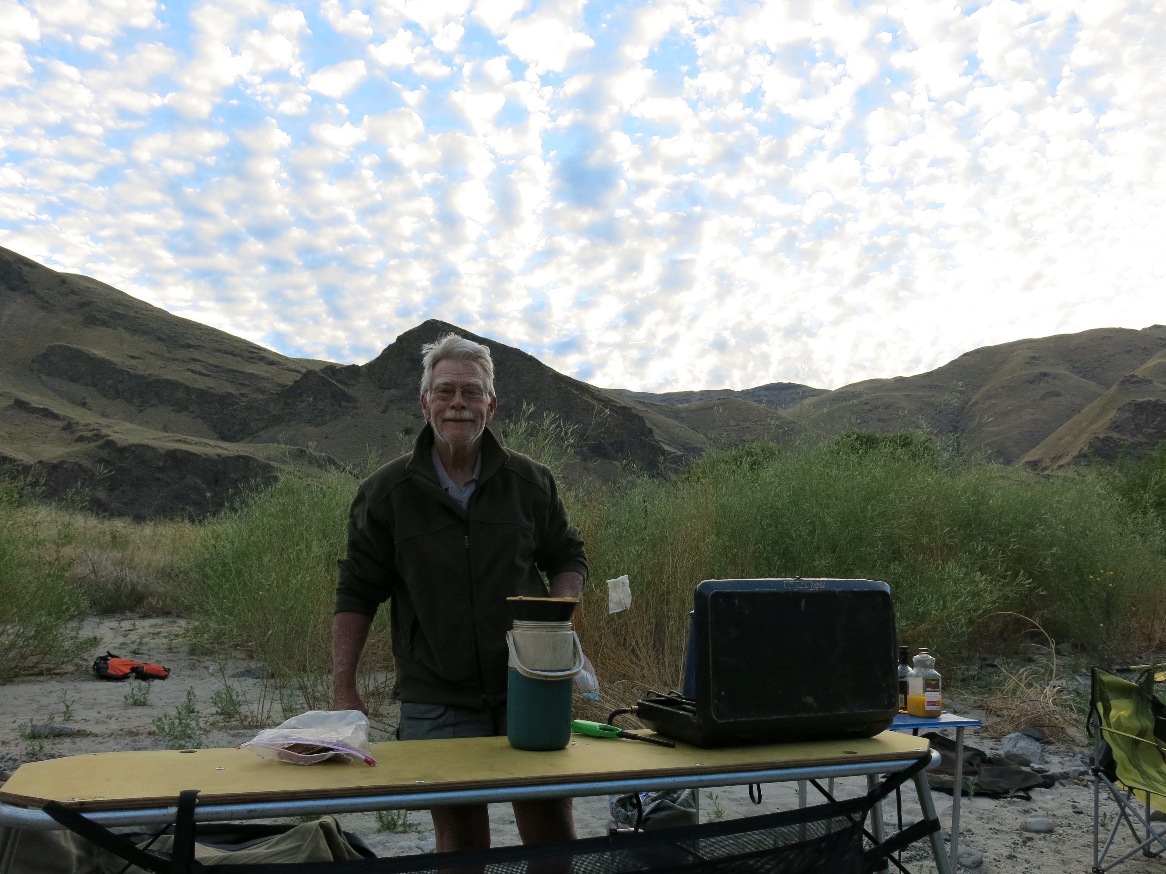 The Lop-Eared Mule develops a leak. (Actually, many leaks.)Even after patching, the Lop-Eared Mule requires frequent pumping to stay afloat. Marty rows while Susie pumps . . . and pumps . . . and pumps.Keith tries for a sturgeon. Like Santiago in Hemingway’s Old Man and the Sea, Keith talks to the fish. “Fish,” he said, “I love you and respect you very much, but I will kill you dead before this day ends.”Keith prepares early morning coffee while everyone else sleeps.A beautiful sandy beach camp.